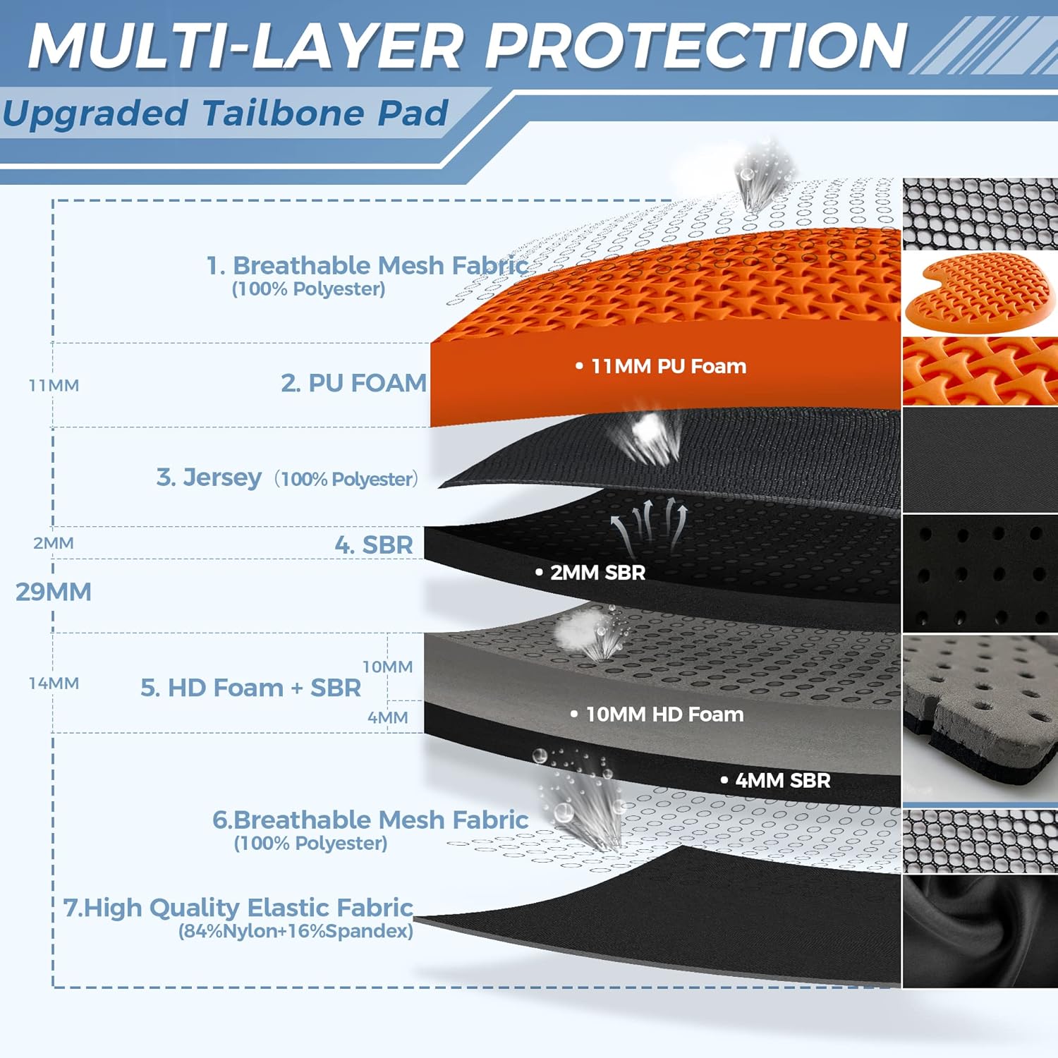 DETACHABLE EXTRA BUTT PADS - To cater to the diverse needs of sports enthusiasts across various seasons and activities, we've designed outer orange padding to be detachable. Our tailbone protection features a dual-layered structure for enhanced safeguarding. It comprises a built-in thick foam layer along with an additional removable butt pad. This allows you the flexibility to choose whether to remove the extra protective layer based on your specific requirements.